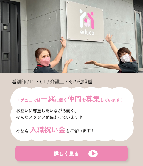 エデュコはお子様から大人まで医療と福祉の様々な支援を提供しています。 訪問看護・リハビリテーション・相談支援事業所・住宅型有料老人ホームなど、 事業を通してだれもが心地よくくらす未来を目指しています。 訪問看護・リハビリは経験よりもやる気がある、 地域医療に貢献しながらも楽しく働きたいとい方が向いています。 また、通常の看護やリハビリに加えて医療リンパドレナージや心理学を学び実践したい方、 子育てや介護と両立したいという方も大歓迎です。 エデュコにはお互いを尊重しあいながら働く、そんなスタッフが集まっています。』